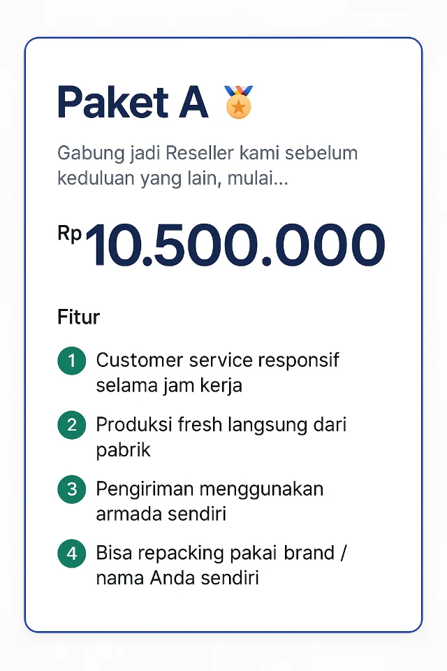 Mitra bukanlah distributor dan tidak memiliki posisi yang sama. Kami tidak membuka posisi distributor karena ada syarat khusus, termasuk target pembelian bulanan minimal 30% dari kapasitas produksi.